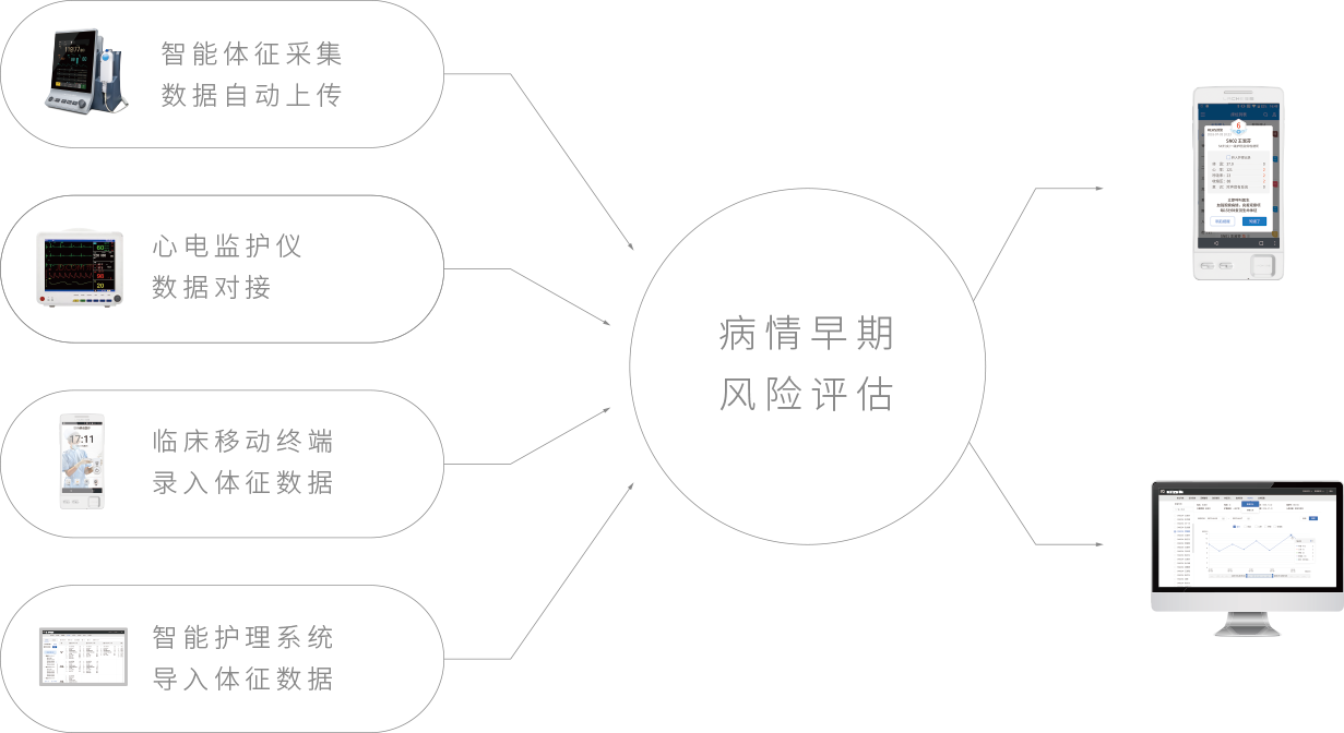 通過智能設備自動采集上傳體征數據,自動完成即時病情風險評估,并為護士提供程序化、標準化的匯報語言和措施建議,實現早期、準確的決策干預,提高診療及護理水平,保障病人安全。