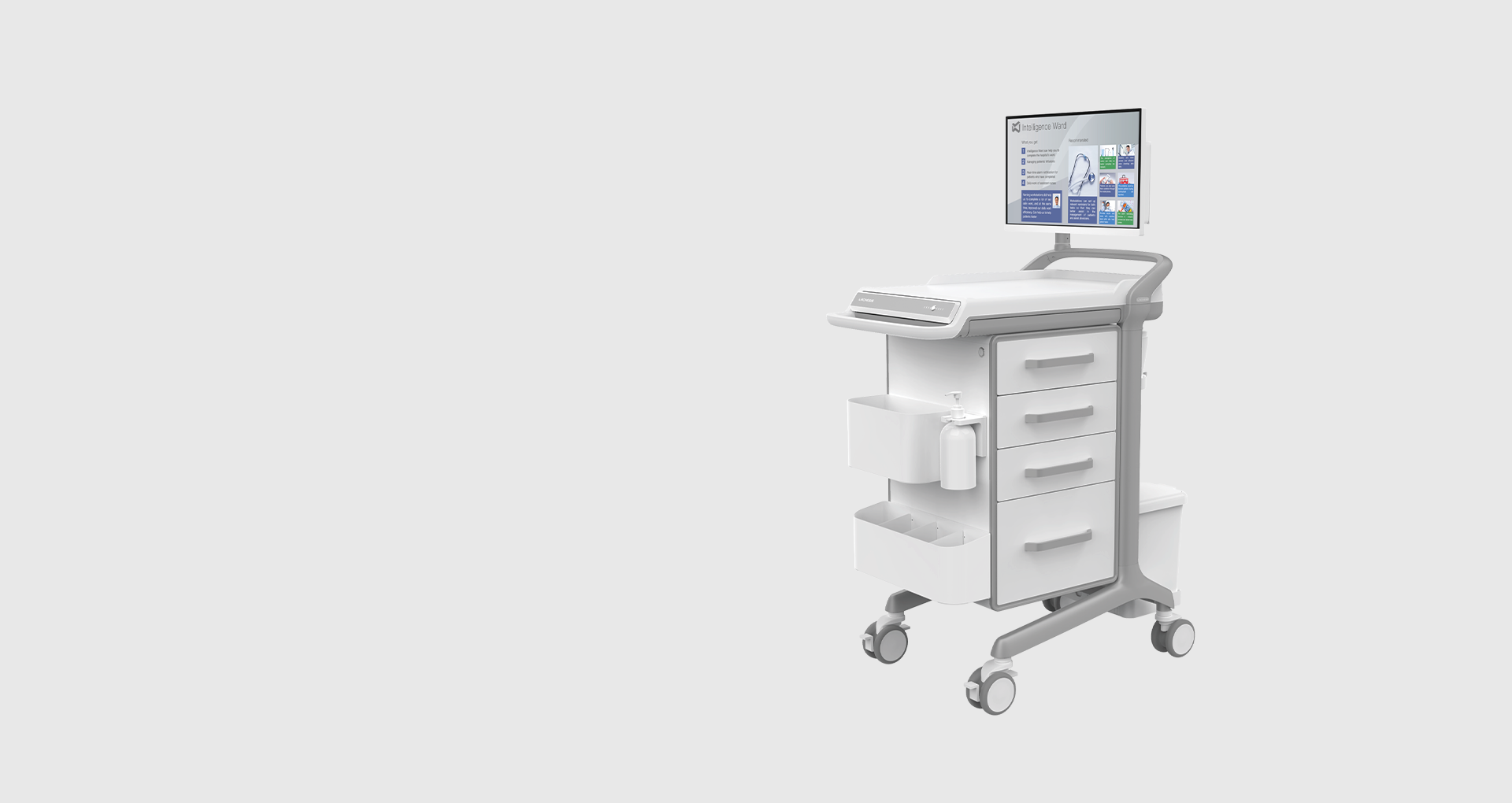 全車線纜隱藏式設計 ,臺面無銳角圓弧設計 ,超靜音防滑防纏繞腳輪等,讓智能移動工作站擁有業界獨特的產品氣質,更符合醫療使用場景需求。